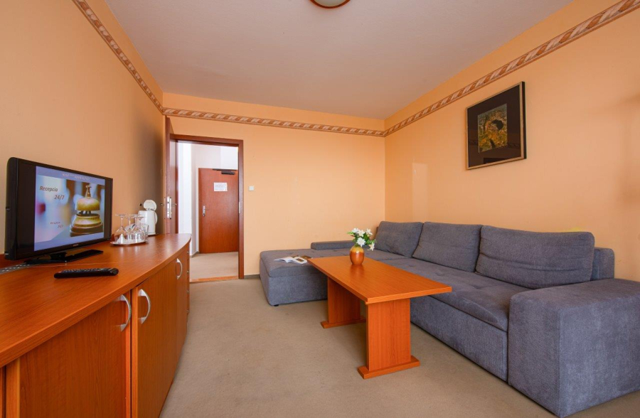 Vkusne zariadený apartmán ponúka priestrannú samostatnú obývaciu a spálňovú časť. V spálni sa nachádza manželská posteľ pre 2 osoby, v obývacej časti pohodlný rozkladací gauč pre 2 osoby. Detská postieľka na vyžiadanie.